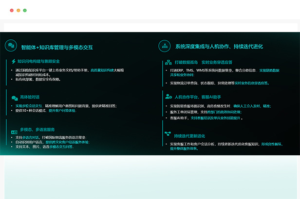 • 智能体+知识库+多模态交互,精准意图与上下文理解